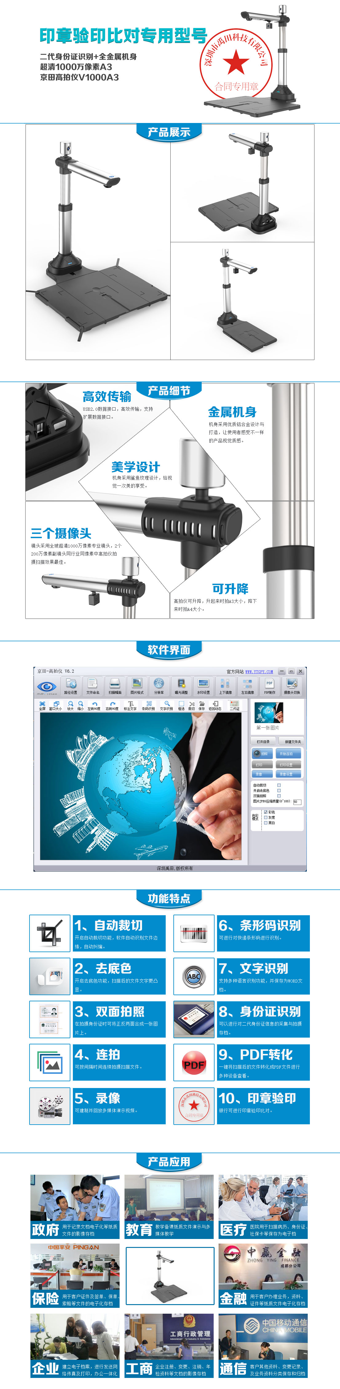 | 底座 | 可扩展USB接口,可接验印、二代证模块、U盘等 |